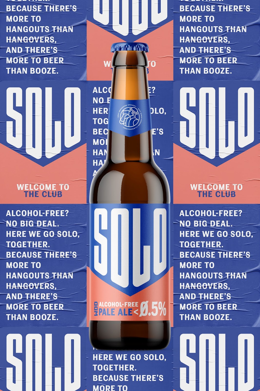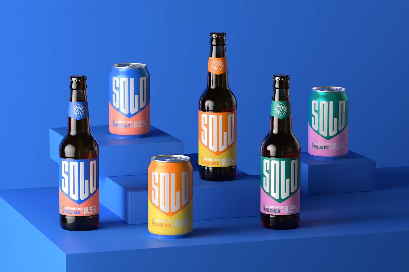 Solo無酒精啤酒包裝,三個關鍵詞運動感,下箭頭,對比色。抓住了人們心智厭惡混亂的特點,簡潔明了的描述了產品賣點無酒精淡啤,通過向下的箭頭不斷暗示消費者酒精度數已經下降到零,對比色區分信息,增強識別性。